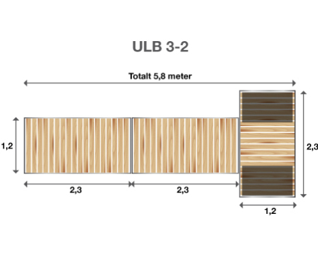 Brygga Ulpukka ULB 3-2 är en lätt flytbrygga med en totallängd på 5.8 meter. Den består av 3 sektioner, vardera 1.2 m x 2.3 m, som enkelt monteras ihop till en T-formad brygga. När du köper en Ulpukka brygga är alla monteringsdetaljer som bultar och muttrar inkluderade.