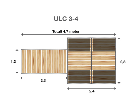 Brygga Ulpukka ULC 3-4 är en flytbrygga med en totallängd på 4.7 meter. Den består av 3 sektioner, vardera 1.2 m x 2.3 m. Den stora och stabila bryggdelen längst ut gör att den här bryggan känns rymlig att vistas på.