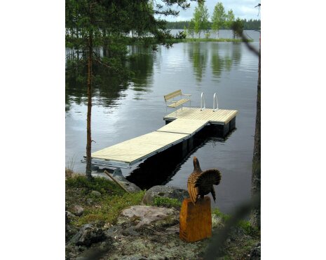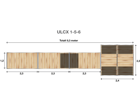 Brygga Ulpukka ULCX 1-5-6 är en stor flytbrygga med en totallängd på hela 9.3 meter. Den består av 5 sektioner, vardera 1.2 m x 2.3 m. Den stora och stabila bryggdelen längst ut gör bryggan rymlig och tryggare att vistas på. Ett gångjärn på mitten av landgången gör att din brygga, oavsett vattenstånd, alltid ligger i våg utanför gångjärnet.