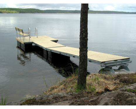 Komplett flytbrygga med kombinerat land- och bergfäste. Stor och stabil bryggdel längst ut.