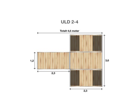 Brygga Ulpukka ULD 2-4 är en brygga med en totallängd på 4.6 meter. Den består av 4 sektioner, vardera 1.2 m x 2.3 m. Den extra stora och mycket stabila bryggdelen längst ut mäter hela 3.6 m x 2.3 m och gör bryggan väldigt rymlig och tryggare att vistas på än en mindre.