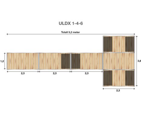 Brygga Ulpukka ULDX 1-4-6 är en stor brygga med en totallängd på hela 9.2 meter. Den består av 6 sektioner, vardera 1.2 m x 2.3 m. Den extra stora och mycket stabila bryggdelen längst ut mäter 3.6 m x 2.3 m och gör bryggan mycket rymlig, och tryggare att vistas på än en mindre. Ett gångjärn på landgången gör att din brygga, oavsett vattenstånd, alltid ligger i våg utanför gångjärnet.
