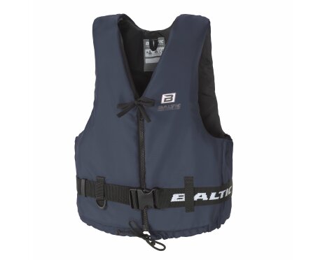 En snygg flytväst i klassisk seglarmodell i marinblå färg med svarta detaljer.