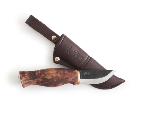Finsk kniv för jägare eller som allroundkniv för vandrare. Skaft av masurbjörk, knivlängd 19 cm.