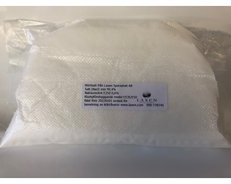 5 liter vatten, 800 gram nitritsalt och 150 gram strösocker. (Behöver du 10 liter vatten så dubblar du bara mängden salt och socker)