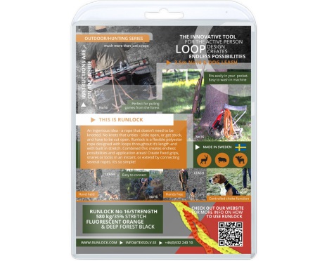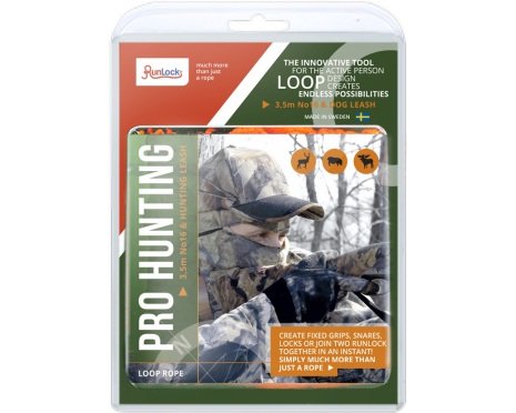 Runlocks Jaktset är anpassat för jägare och innehåller både ett längre öglerep för att enkelt snara bytet och transportera eller dra det ut ur skogen samt ett smart lättvikts jaktkoppel för hunden. Kopplet har reglerbar halstryp-funktion och enkelt att ställa in efter alla olika halsvidder på hundar. Med Runlock behövs inga knutar och du skapar snabbt och enkelt fasta öglor, snaror och lås som är enkla att låsa upp och som inte glider.