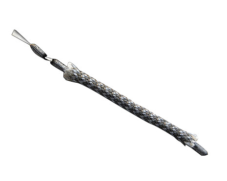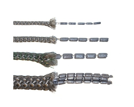 Blyteln med ytterhölje i flätad polypropylen, används som sänke till garn och fiskenät.
