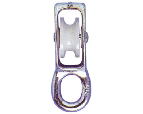 Skivblock som används på stållina eller vanlig lina vid upphängning av skyddsnät så du enkelt kan dra nätet åt sidan.